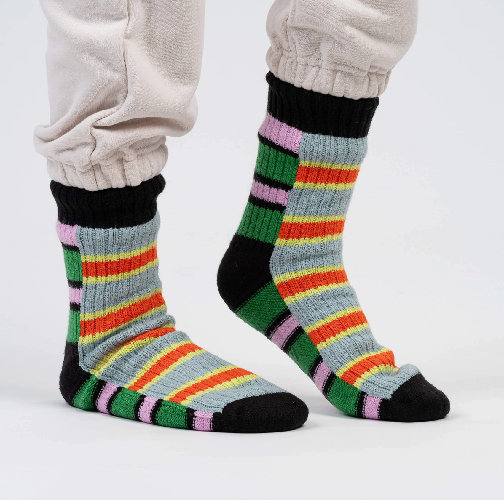 These unisex fleece-lined knit sock slippers are the best of both worlds! The easy fit of socks meets the plush comfort of house slippers. Our striped House Socks are meant to mix and match—and keep you cozy indoors. These soft knitted socks are fully lined with fluffy faux fleece for extra warmth. Non-slip patches on sole. Machine washable.