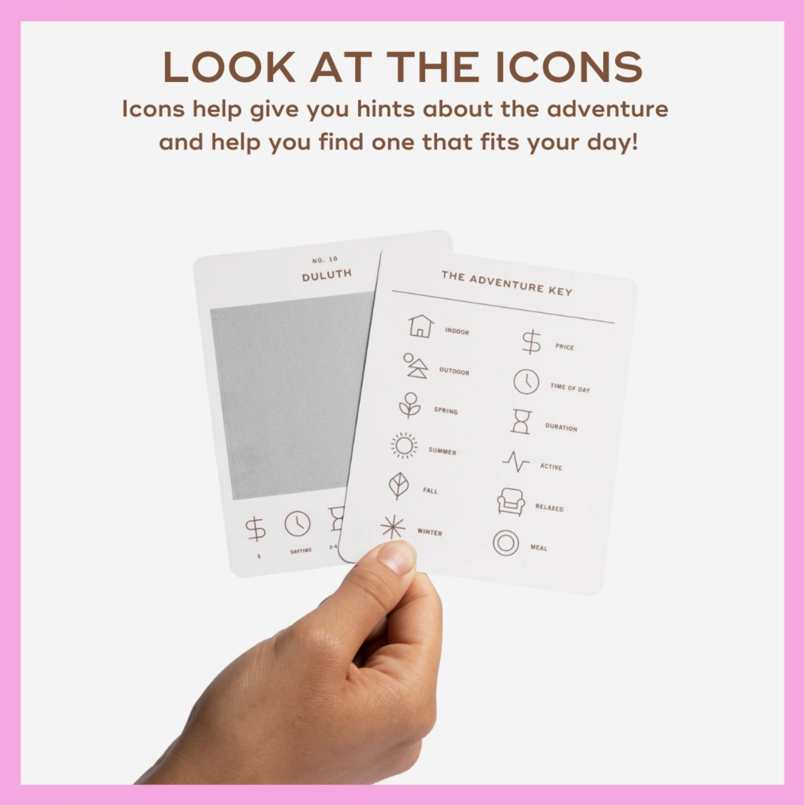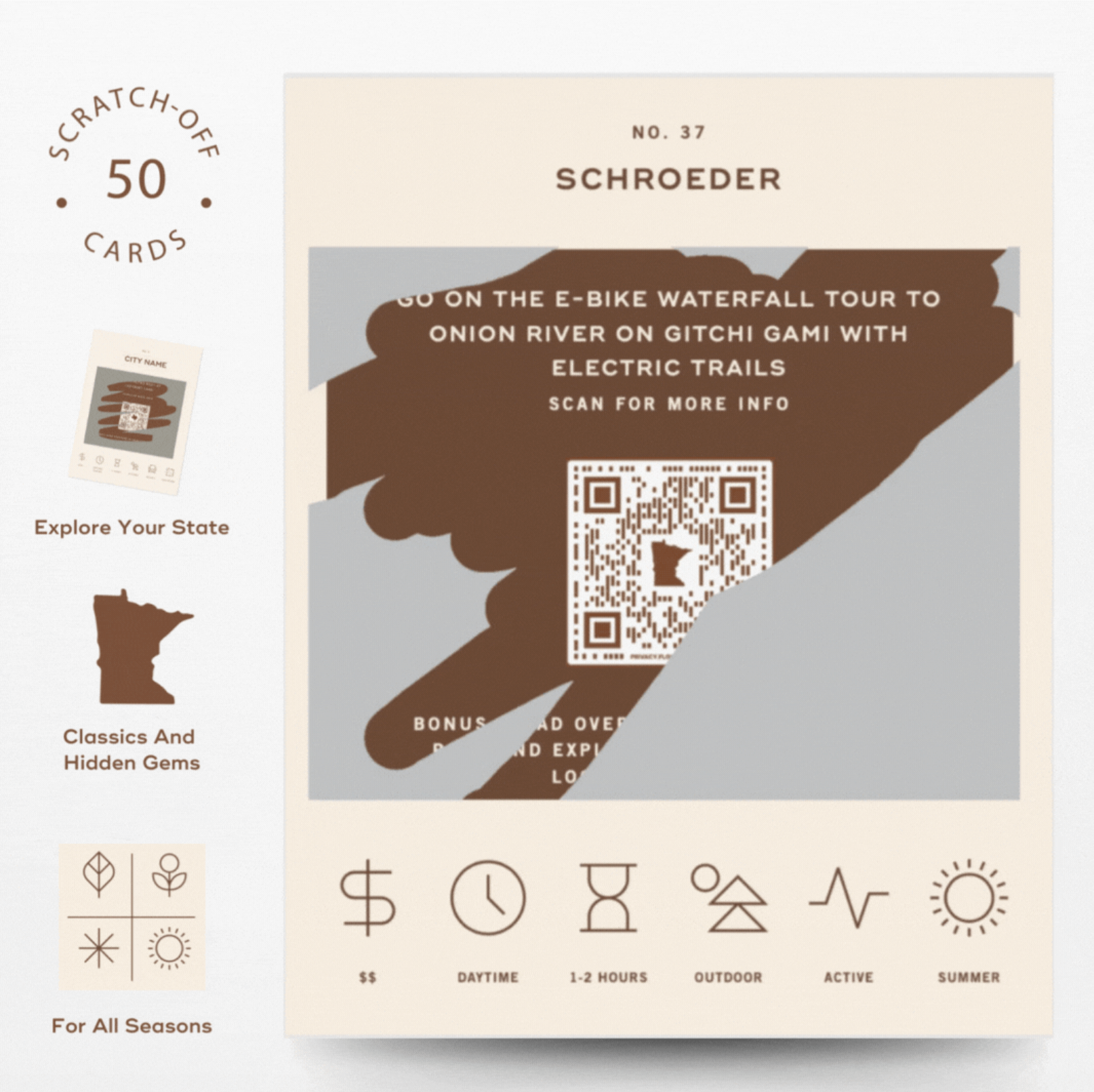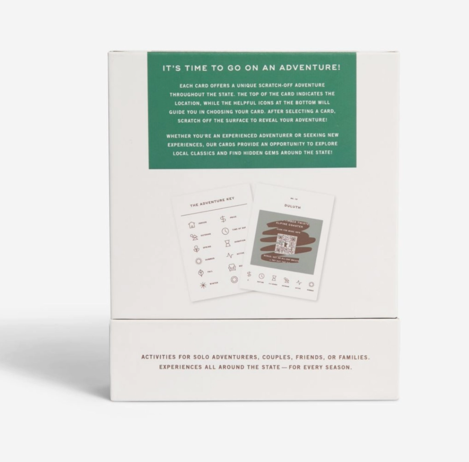 50 scratch off bucket list adventures around the state of Minnesota. Pick a city that you want to explore, check out the icons at the bottom of the card to determine the season, cost, and time of day, and then scratch off the card to reveal your adventure!