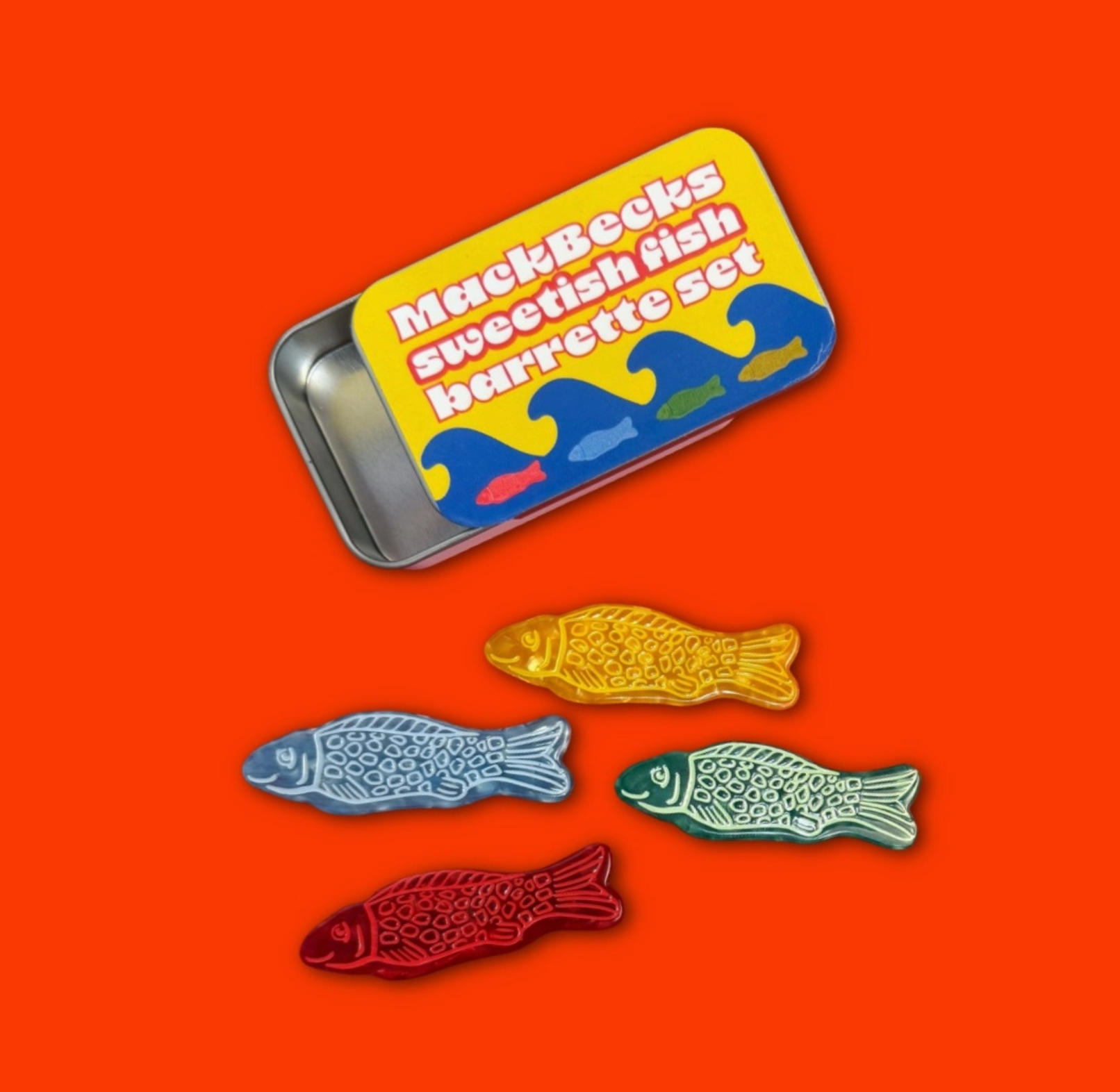 A candy-aisle classic — served in barrette form for your sweetest styling yet. A signature MackBecks design and the perfect companion to our best selling Sweetish Fish Earrings, this four-piece barrette set turns your favorite gummy treat into everyday hair essentials.