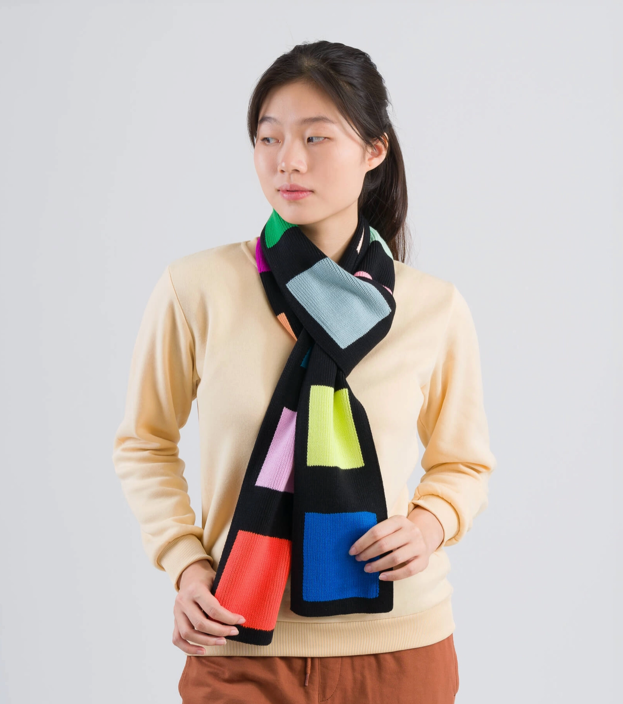 A vintage-inspired long skinny scarf knitted with modern blocks of color on a solid ground. Colorful, reversible, and unisex. For indoor and outdoor wear. Can be tied and wrapped in many different ways depending on weather or mood. Knit with new and repurposed deadstock yarn. Details 100% Soft Acrylic Machine wash cold gentle cycle, dry flat 84”L x 5”W