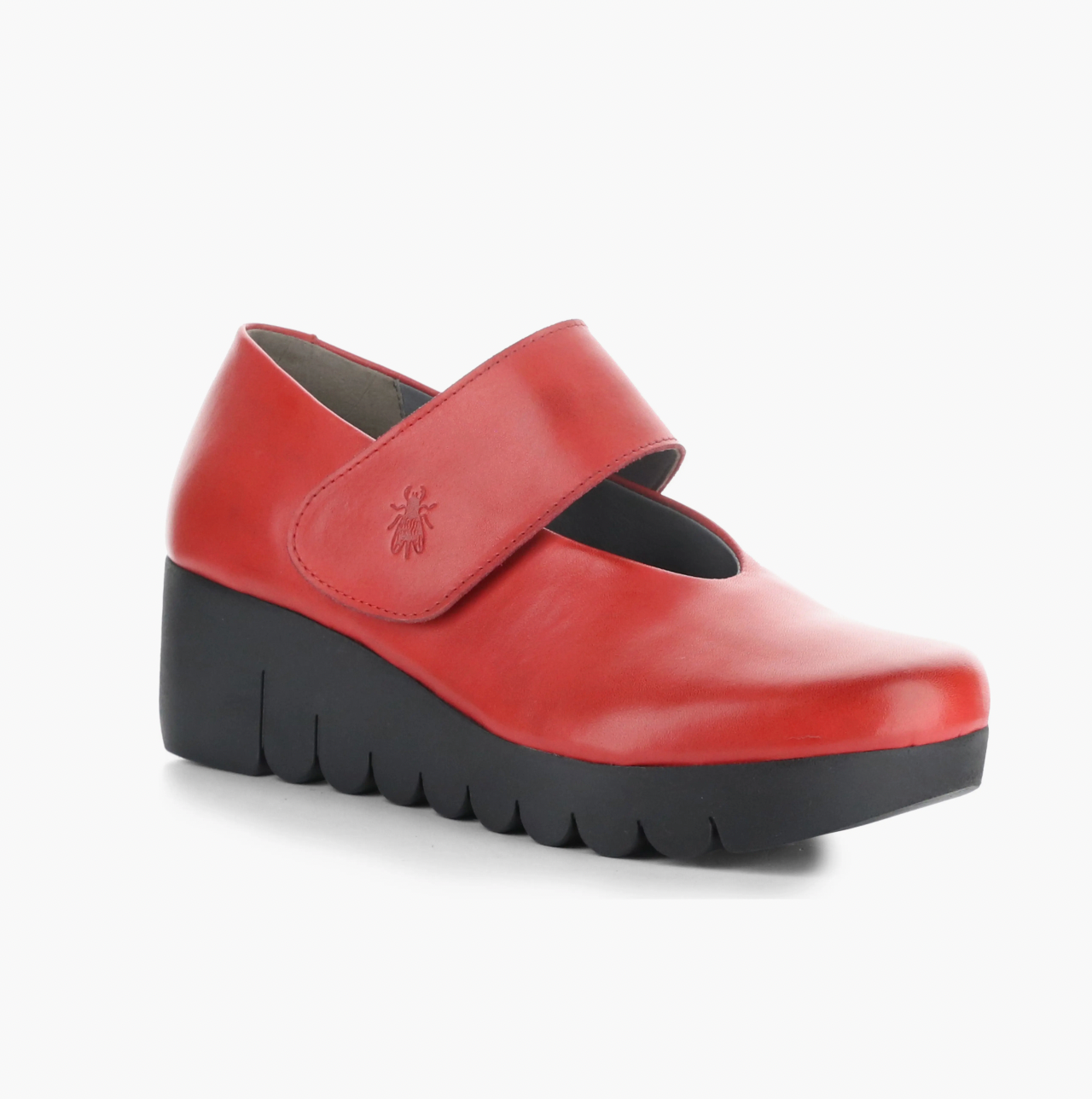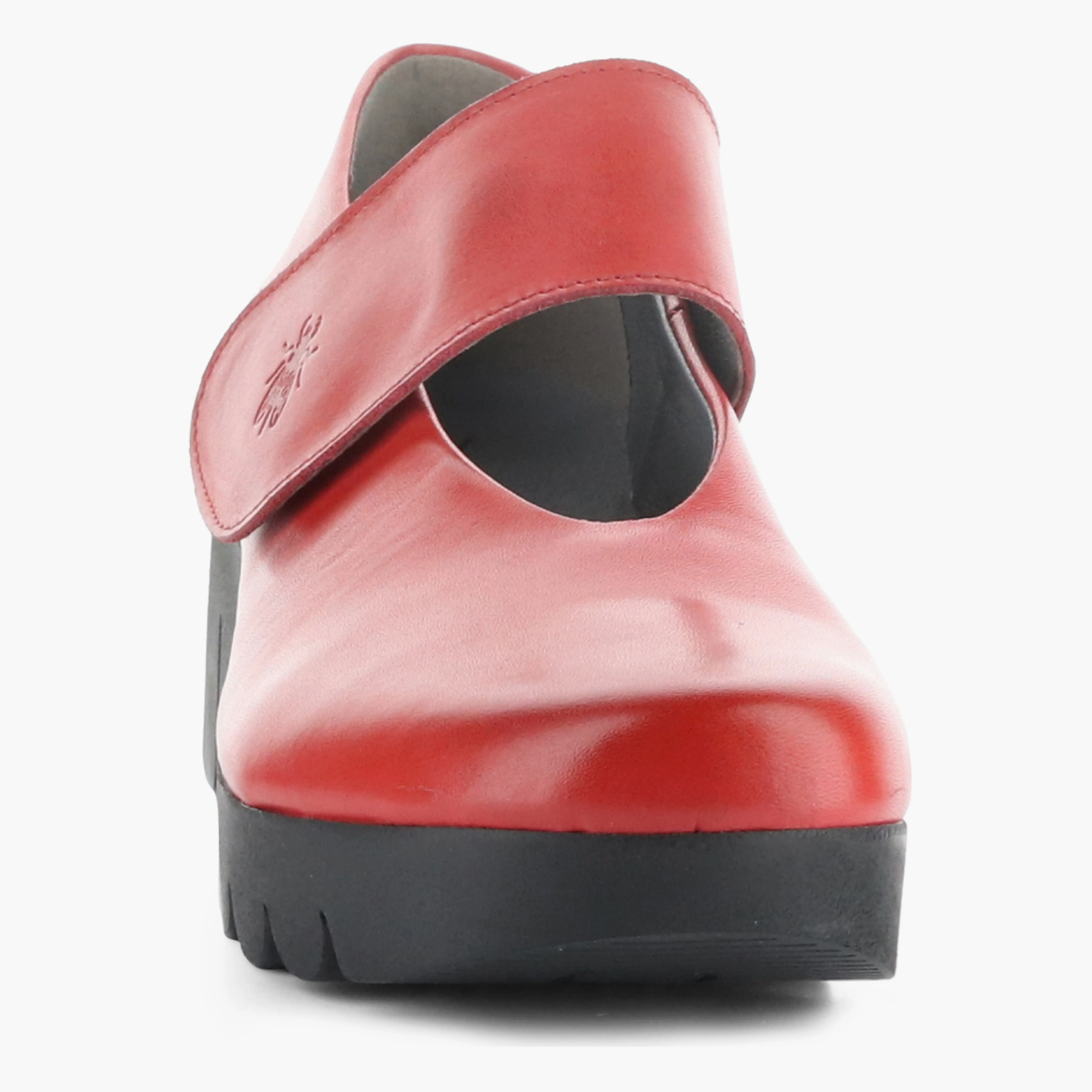 Step out in style with this stunning red leather wedge featuring a bold, wide mary jane strap. The shoe combines a robust 2" wedge heel and 1" platform for added height and comfort. An adjustable hook-and-loop closure ensures a perfect fit, while the cushioned footbed provides all-day support. Crafted with a leather upper, textile lining, and synthetic sole, this memorable maryjane is made in Portugal to guarantee quality and durability.